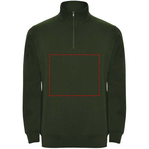 Sweatshirt met halve rits in dezelfde kleur en staande kraag. Binnenkant van de kraag in dezelfde kleur. Versterkte naadafdekkingen aan de binnenzijde van de kraag. Manchetten en tailleband in ribboord 1x1. Het model is 185 cm en draagt maat M.